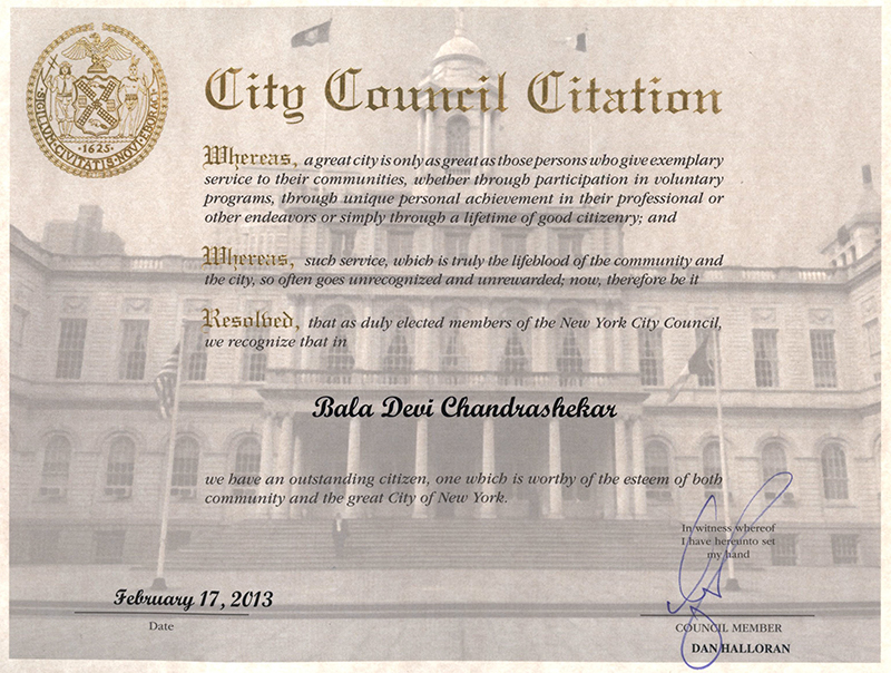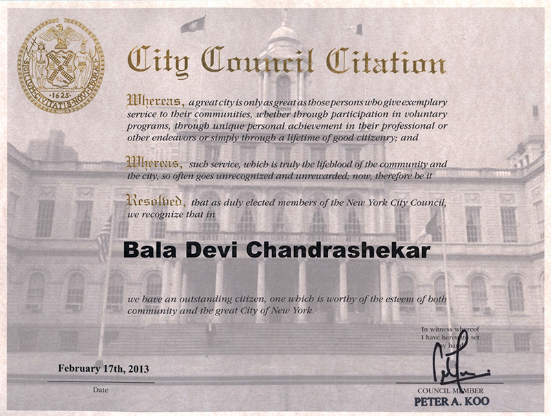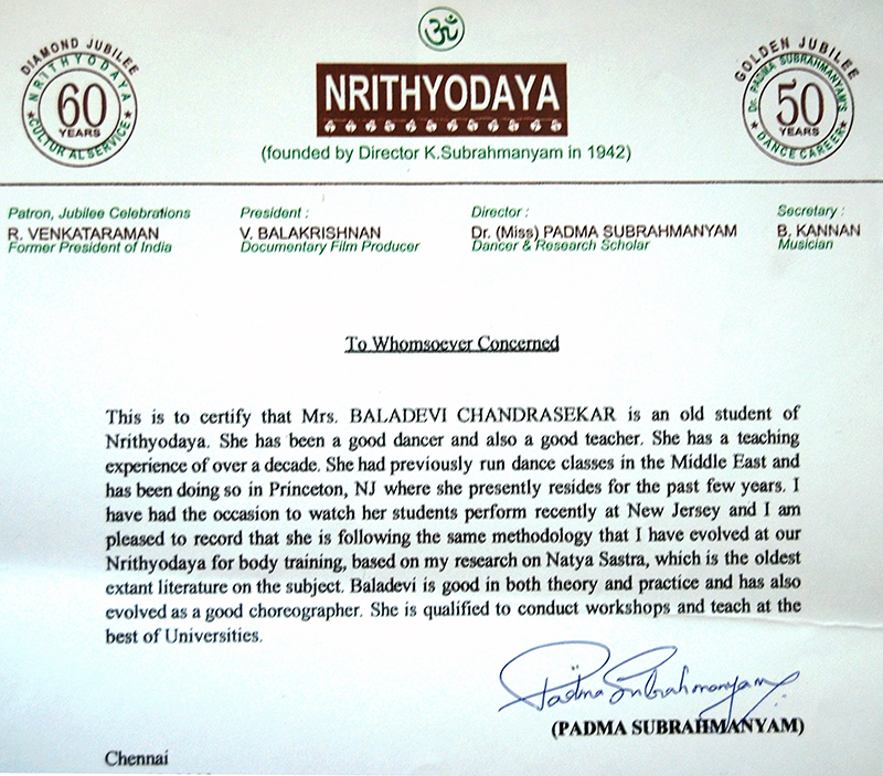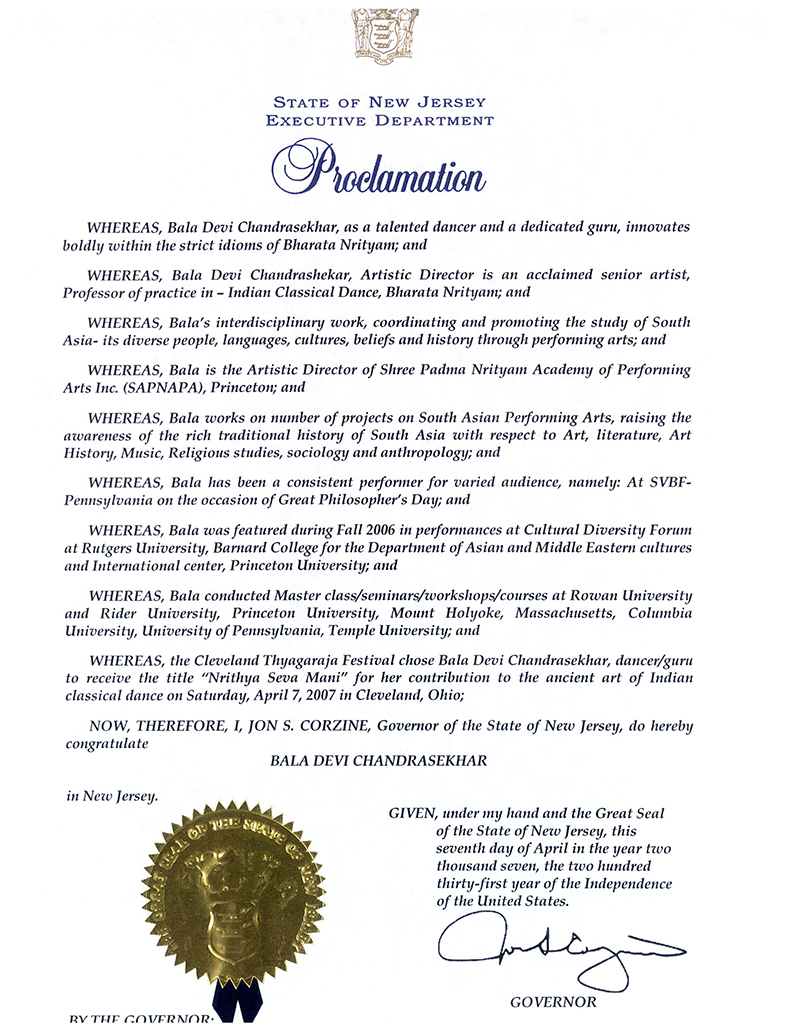 Shree Padma Nrityam Academy of performing Arts Inc. (SPNAPA) based in New Jersey, serves as a facilitator for cultural preservation, presentation, and exchange of ideas for South Asian Performing Arts with a primary focus on Indian classical dance - bharatanatyam. Trained under eminent Guru, the noted bharatanatyam exponent Dr. Padma Subrahmanyam, Bala - a bharatanatyam teacher par excellence, works on developing and perfecting the style that would be seamless and fluid while yet retaining the precision, power and purity of line - typical of classical dance. Bala had the unique opportunity to learn the core components of the 108 Karanas (temple sculptures). The Karanas are governed by artistic laws of permanent value of Natya Sastra, which is the specialty of her Guru Dr. Padma Subrahmanyam a great teacher - whose scholarly thesis on Karanas remains an inspiration to exponents in this field. This New Jersey based premier Bharatanatyam school teaches the revived dance technique translating theoretical concepts into practice, based on her Guru Dr. Padma Subrahmanyam research and teaching. Dr Padma Subrahmanyam has awarded the titles "Bharata Nrtya Seva Mani" and " Nrtyasali- completed course in 108 Karanas" to Bala Devi Chandrashekar. The New Jersey State Senate and General Assembly passed a joint resolution Honoring Bala Devi chandrashekar in Recognition of service to the Indian Community.