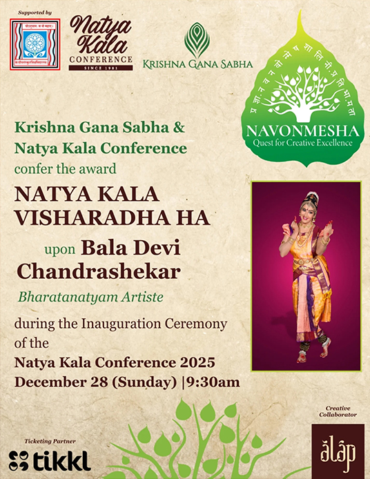 - 28th December 2025 - 9.30am - Krishna Gana Sabha & Natya Kala Conference confer the award "Natya Kala Visharadha Ha" upon Bala Devi Chandrashekar, Bharatanatyam artiste during the Inauguration Ceremony of the Natya Kala conference Chennai