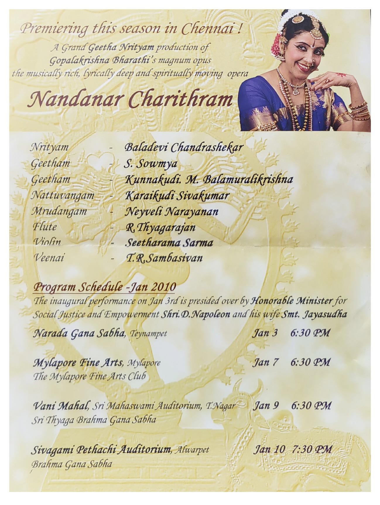 - 10th January 2010 - 7.30 pm - A Grand Geetha Nrityam production of Gopalakrishna Bharathi's magnum opus the musically rich, lyrically deep and spiritually moving opera "Nandanar Charithram" - Sivagami Pethachi Auditorium, Brahma Gana Sabha, Alwarpet Chennai